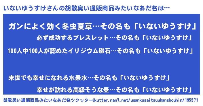 | 男性向けラノベタイトル風あだ名 | 『おまえをオタクにしてやるから、俺をいないゆうすけにしてくれ! 』 |