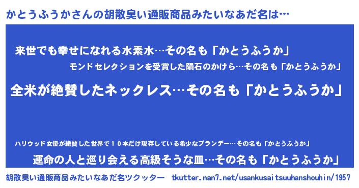| ヘコむあだ名 | 『かと太郎』『かとうふうか(震え声)』 |
