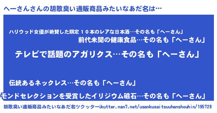| 意味不明あだ名 | 『自称へーさん』『永久保存へーさん』 |