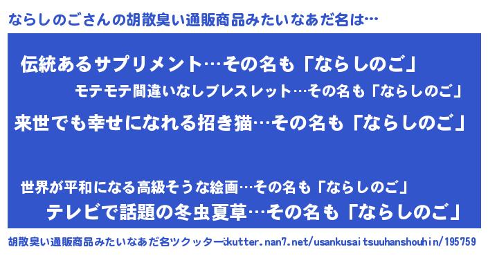 | 意味不明あだ名 | 『永久保存ならしのご』『自称ならしのご』 |
