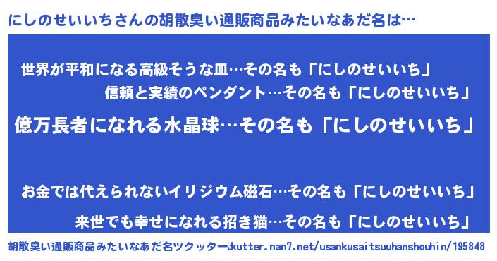 | ヘコむあだ名 | 『にしにゅー』『なまこ酢』『にしを』 |