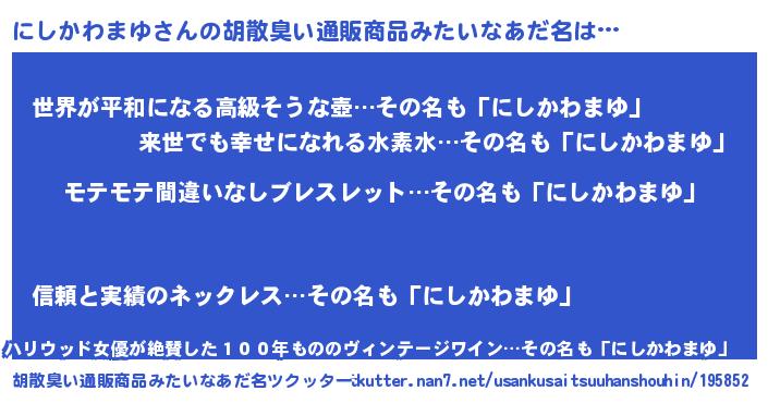 | 男性向けラノベタイトル風あだ名 | 『にしかわまゆの憂鬱』 |