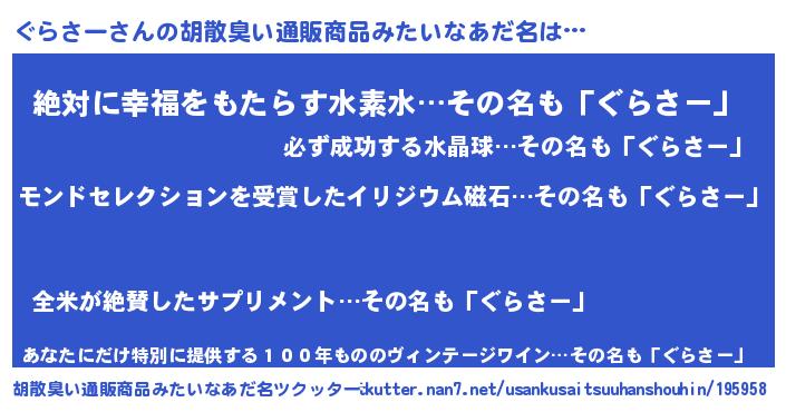 | 男性向けラノベタイトル風あだ名 | 『ぐらさーに滅ぼされるだけの簡単なお仕事です』 |