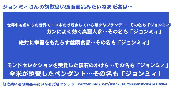 | 意味不明あだ名 | 『永久保存ジョンミィ』『自称ジョンミィ』 |