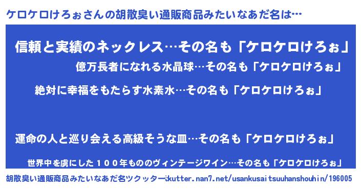 | 男性向けラノベタイトル風あだ名 | 『ケロケロけろぉという概念が存在しない退屈な世界 』 |