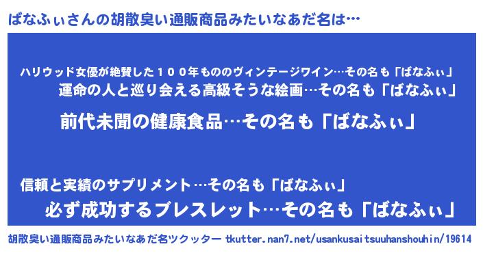 | ヘコむあだ名 | 『ばなふぃ(爆)』『ばなにー』『豆乳』 |