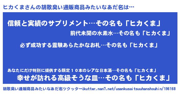 | 男性向けラノベタイトル風あだ名 | 『ヒカくまの憂鬱』 |