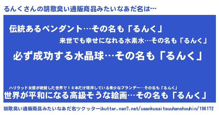 | 女子向けラノベタイトル風あだ名 | 『(仮)るんくのやんごとなき事情』 |