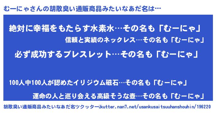 | 男性向けラノベタイトル風あだ名 | 『ムーニャスレイヤー』『むーにゃの憂鬱』 |