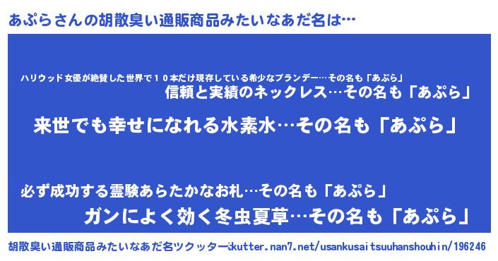 | 意味不明あだ名 | 『永久保存あぷら』『自称あぷら』 |