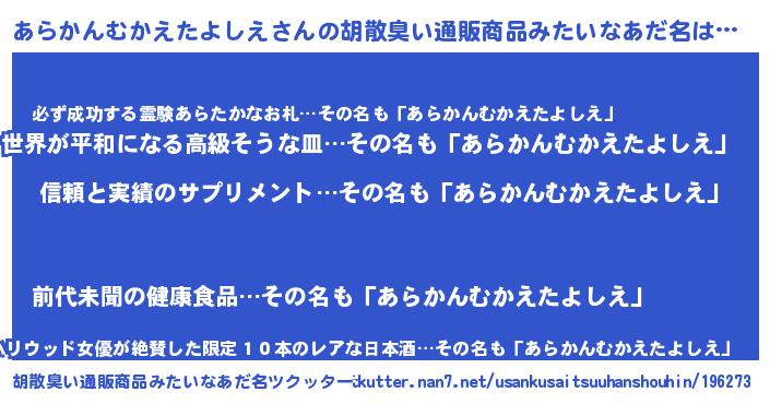 | 男性向けラノベタイトル風あだ名 | 『アラカンムカエタヨシエスレイヤー』 |