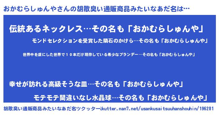 | 男性向けラノベタイトル風あだ名 | 『この素晴らしい世界におかむらしゅんやを!』 |