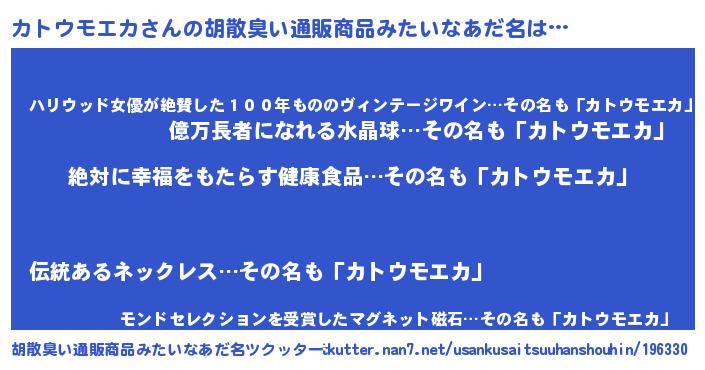 | 女子向けラノベタイトル風あだ名 | 『異世界で失敗しない100のカトウモエカ』 |