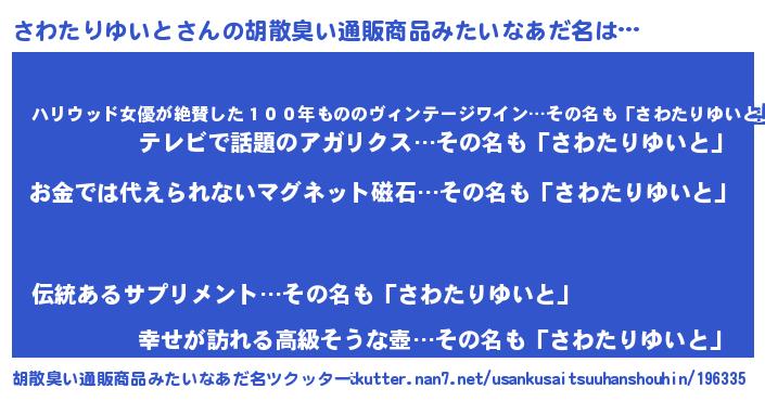 | 男性向けラノベタイトル風あだ名 | 『おまえをオタクにしてやるから、俺をさわたりゆいとにしてくれ! 』 |