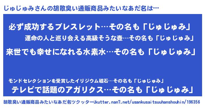 | 男性向けラノベタイトル風あだ名 | 『じゅじゅみという概念が存在しない退屈な世界 』 |