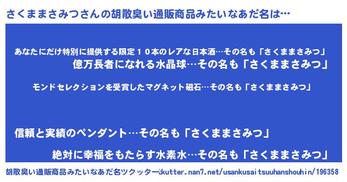 | 男性向けラノベタイトル風あだ名 | 『さくままさみつに滅ぼされるだけの簡単なお仕事です』 |