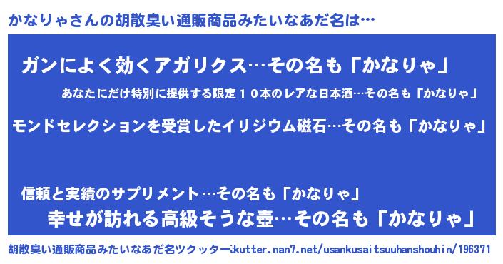 | 男性向けラノベタイトル風あだ名 | 『かなりゃに滅ぼされるだけの簡単なお仕事です』 |