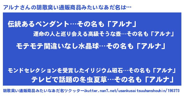 | 男性向けラノベタイトル風あだ名 | 『転生したらアルナだった件』 |