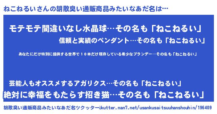 | 意味不明あだ名 | 『住所不定無職ねこねるい(81歳)』 |