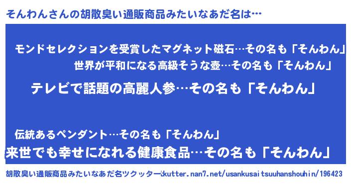 | 意味不明あだ名 | 『自称そんわん』『永久保存そんわん』 |