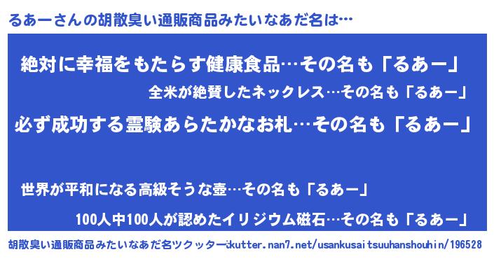 | 男性向けラノベタイトル風あだ名 | 『るあーの憂鬱』 |