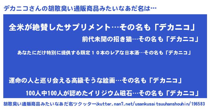 | 男性向けラノベタイトル風あだ名 | 『この素晴らしい世界にデカニコを!』 |