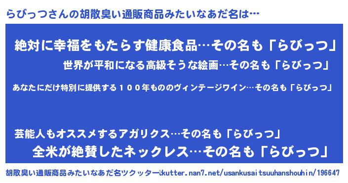 | 意味不明あだ名 | 『住所不定無職らびっつ(4歳)』 |