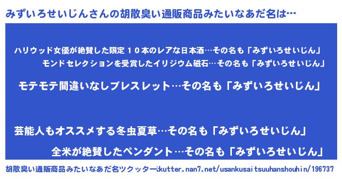 | 男性向けラノベタイトル風あだ名 | 『転生したらみずいろせいじんだった件』 |