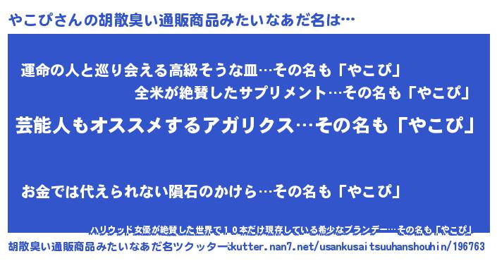 | 男性向けラノベタイトル風あだ名 | 『Re:やこぴから始める異世界生活』 |