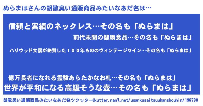 | 意味不明あだ名 | 『住所不定無職ぬらまは(6歳)』 |