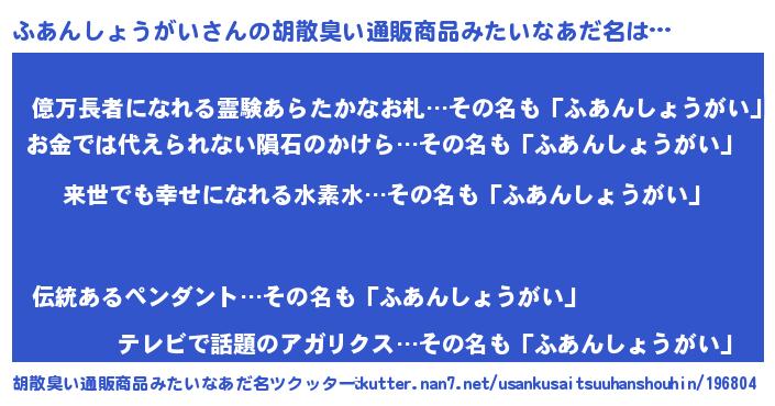 | ヘコむあだ名 | 『ふあんしょうがい(遠い目)』『ふあ太郎』 |