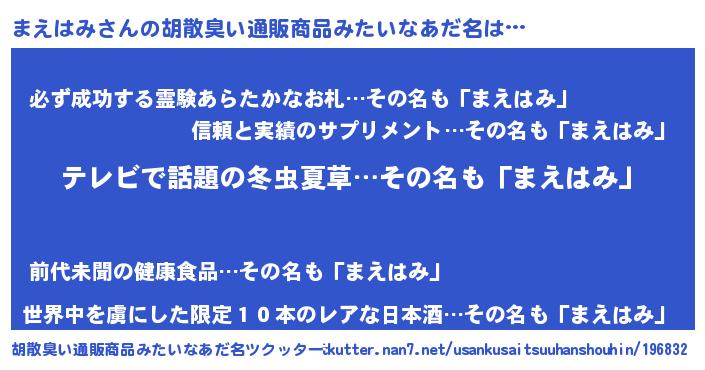 | 意味不明あだ名 | 『自称まえはみ』『ペロリンまえはみ』 |