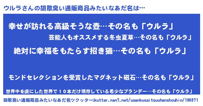 | 男性向けラノベタイトル風あだ名 | 『緋弾のウルラ』『はたらくウルラさま!』 |