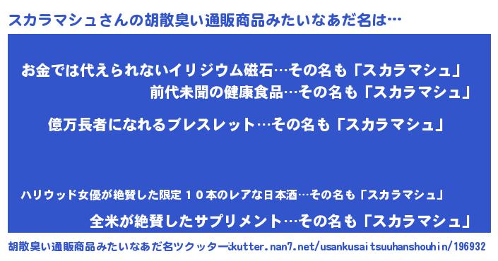 | ヒーロー風カッコイイあだ名 | 『スーパースカラマシュ』『魔戒騎士スカ』 |