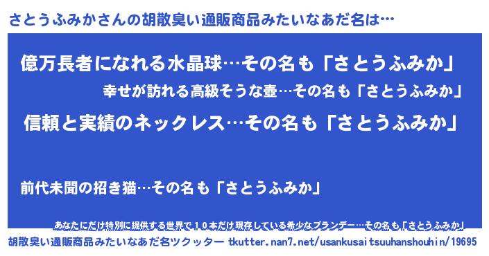 | 男性向けラノベタイトル風あだ名 | 『ダンジョンにさとうふみかを求めるのは間違っているだろうか』 |