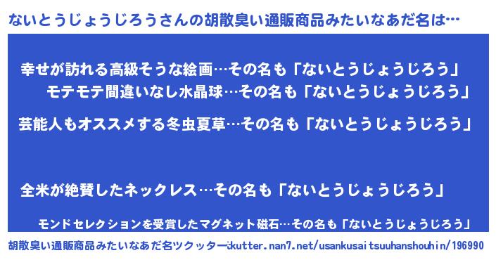 | 男性向けラノベタイトル風あだ名 | 『ないとうじょうじろう~年齢イコール彼女いない歴の魔法使い~』 |