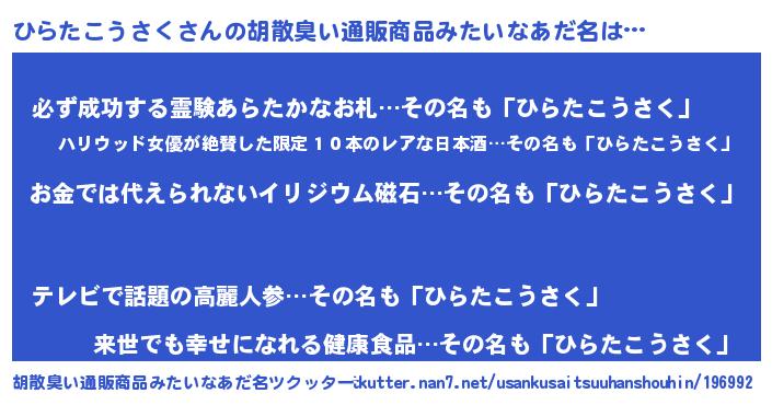 | ヘコむあだ名 | 『ひらにゅー』『ひらたこうさく(遠い目)』 |