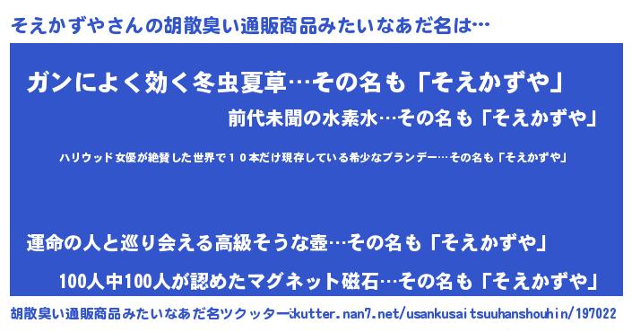 | 意味不明あだ名 | 『住所不定無職そえかずや(98歳)』 |