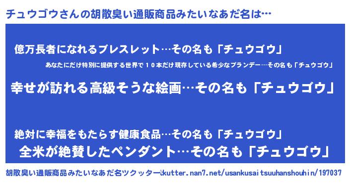 | 男性向けラノベタイトル風あだ名 | 『チュウゴウスレイヤー』 |