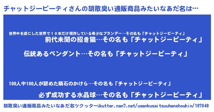 | 意味不明あだ名 | 『とにかく怪しいチャットジーピーティ』 |