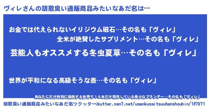 | 女子向けラノベタイトル風あだ名 | 『闇のヴィレ』『ヴィレ夫妻のなれそめ』 |