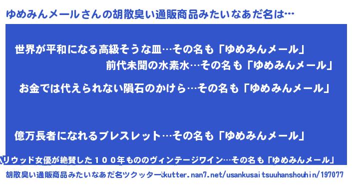 | 男性向けラノベタイトル風あだ名 | 『おまえをオタクにしてやるから、俺をゆめみんメールにしてくれ! 』 |