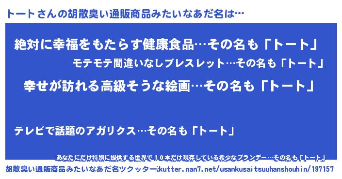 | 意味不明あだ名 | 『トートフォーエバー』『永久保存トート』 |