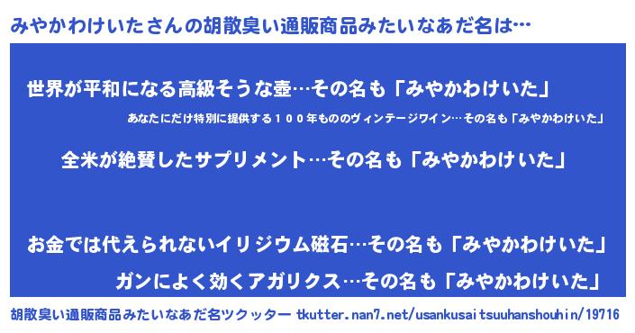 | 意味不明あだ名 | 『とにかく怪しいみやかわけいた』 |