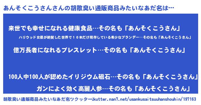 | 男性向けラノベタイトル風あだ名 | 『アンソクコウサンアートオンライン』 |