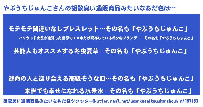 | 男性向けラノベタイトル風あだ名 | 『Re:やぶうちじゅんこから始める異世界生活』 |