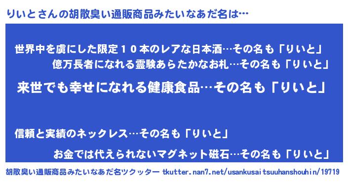 | 男性向けラノベタイトル風あだ名 | 『りいとという概念が存在しない退屈な世界 』 |