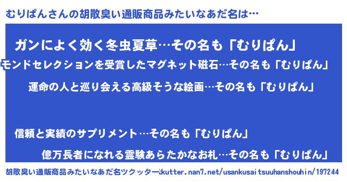 | 男性向けラノベタイトル風あだ名 | 『うちのむりぱんが世界を掌握している!』 |