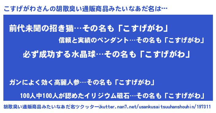 | 男性向けラノベタイトル風あだ名 | 『こすげがわの憂鬱』 |