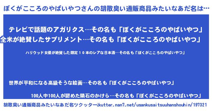 | 意味不明あだ名 | 『住所不定無職ぼくがこころのやばいやつ(50歳)』 |